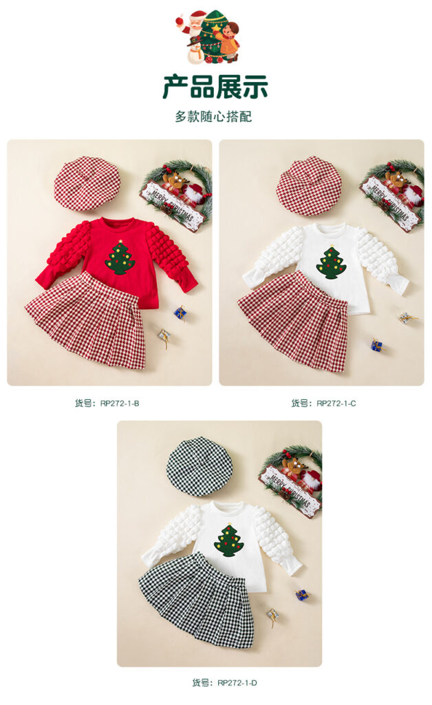 2025 Christmas Autumn and Winter Girl’s Set Fashion Bubble Long Sleeve T-Shirt Pleated Skirt Hat 3-Piece Set